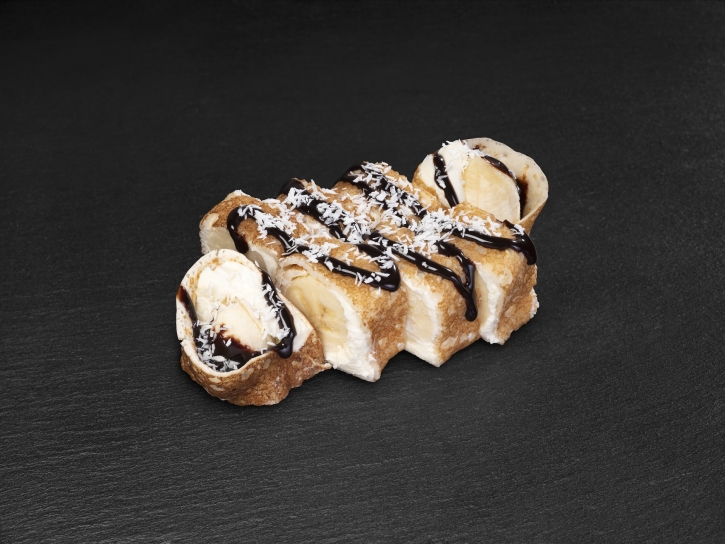 100Plānā pankūka, saldais krēmsiers, banāns, šokolāde, kokosriekstu skaidiņas