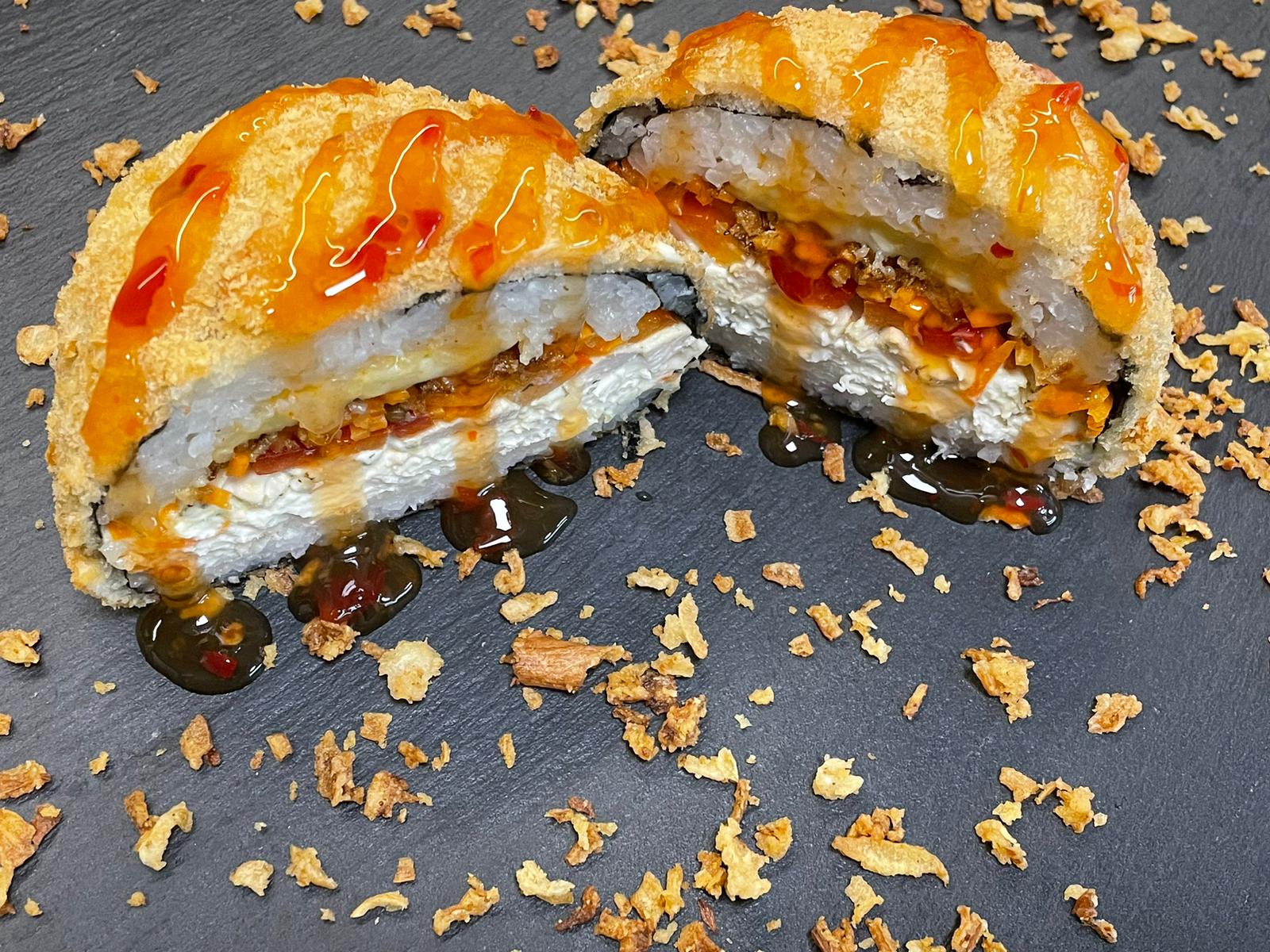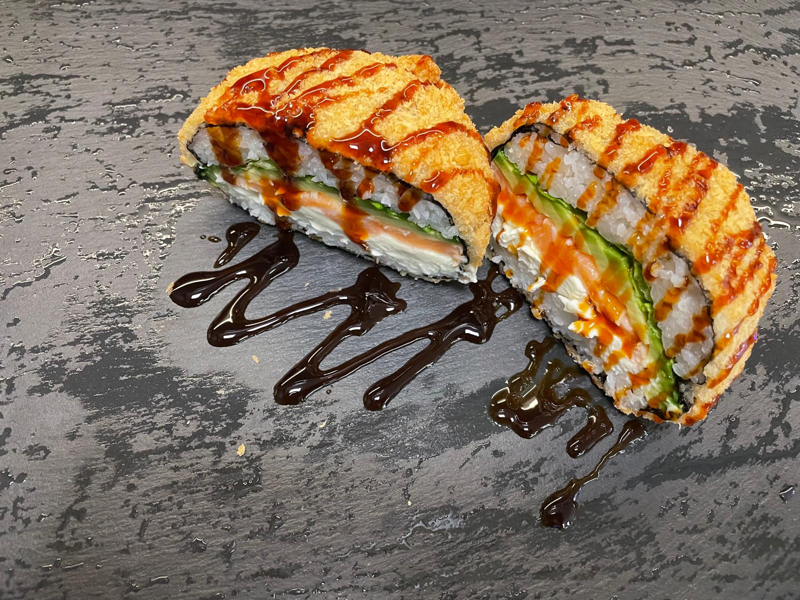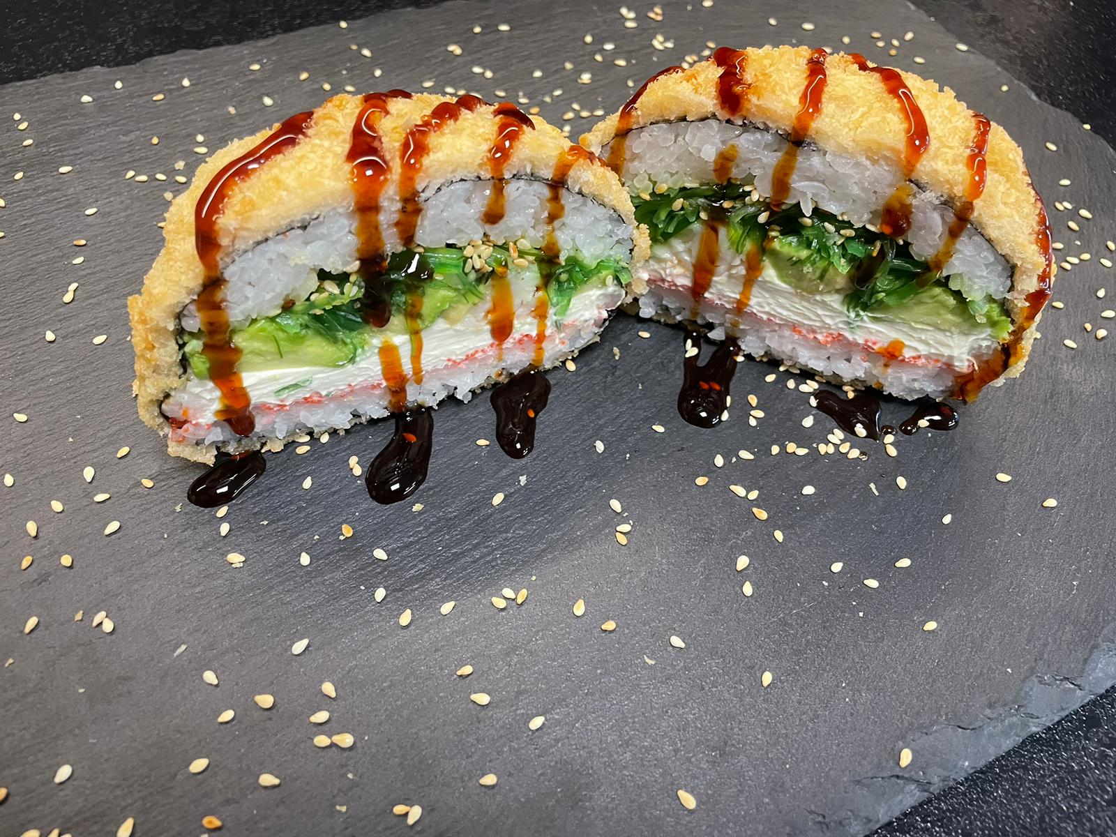 Rīsi, masago, surimi gaļa, krēmsiers, avokado, gurķis, teriyaki.