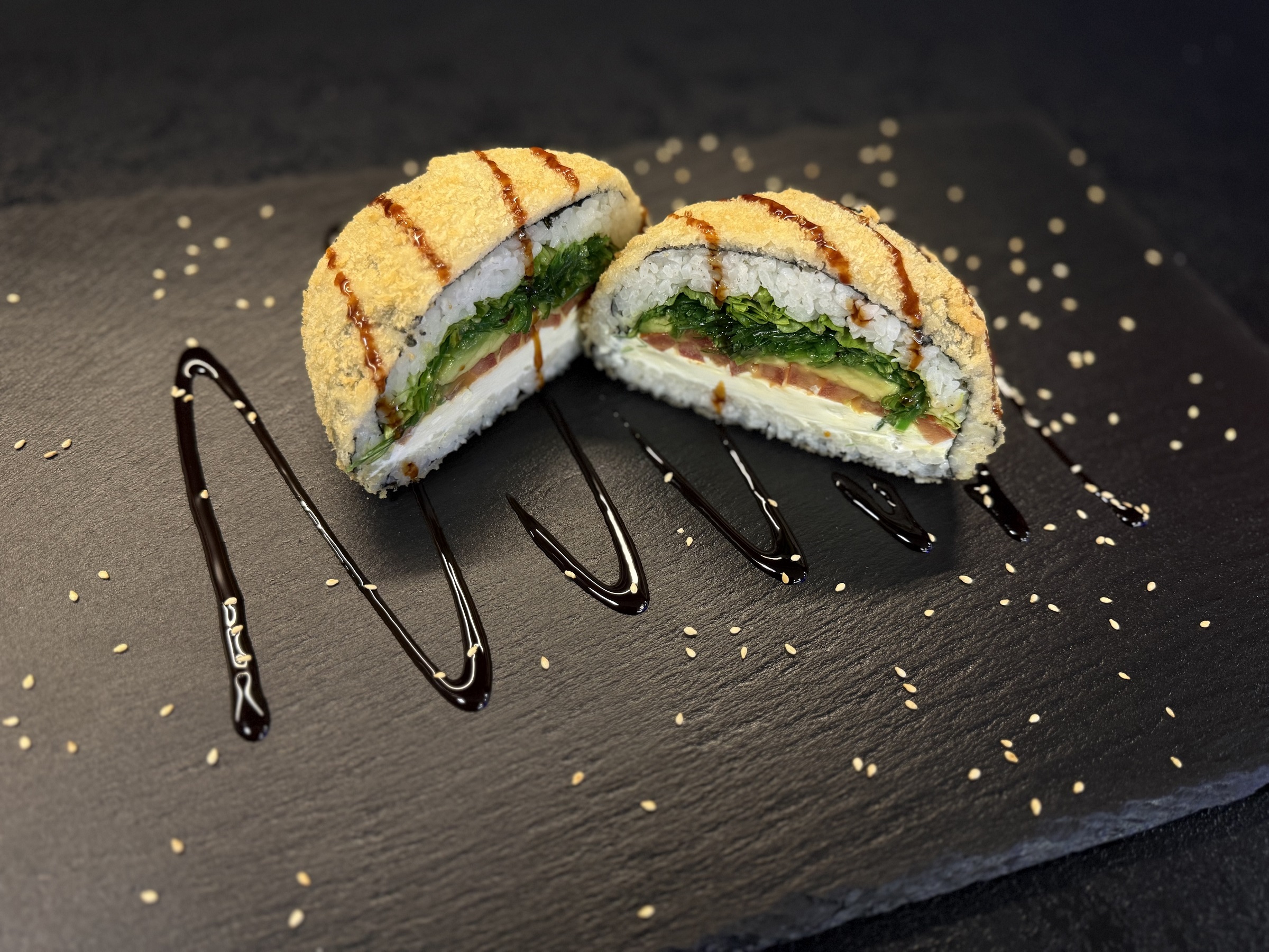 Rīsi, tīģergarneles, masago ikri, krēmsiers, wacame, avocado, sezama sēklas, teryaki.